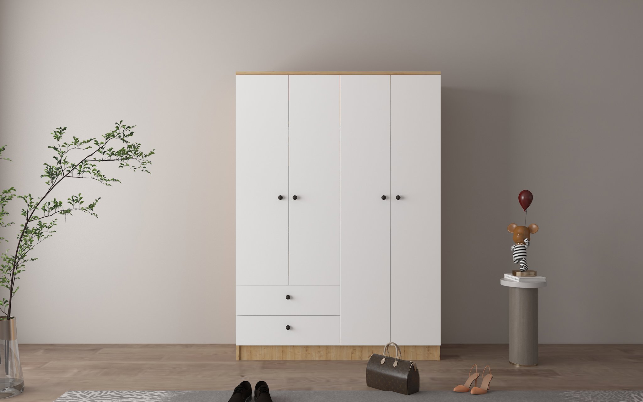 Modern tasarımıyla dikkat çeken bu 4 kapaklı gardırop, geniş iç hacmi ve kaliteli malzemesiyle hem estetik hem de kullanışlı. Safir meşe gövde ve beyaz melamin kapaklar, hem dayanıklılığı hem de zarafeti bir arada sunar.