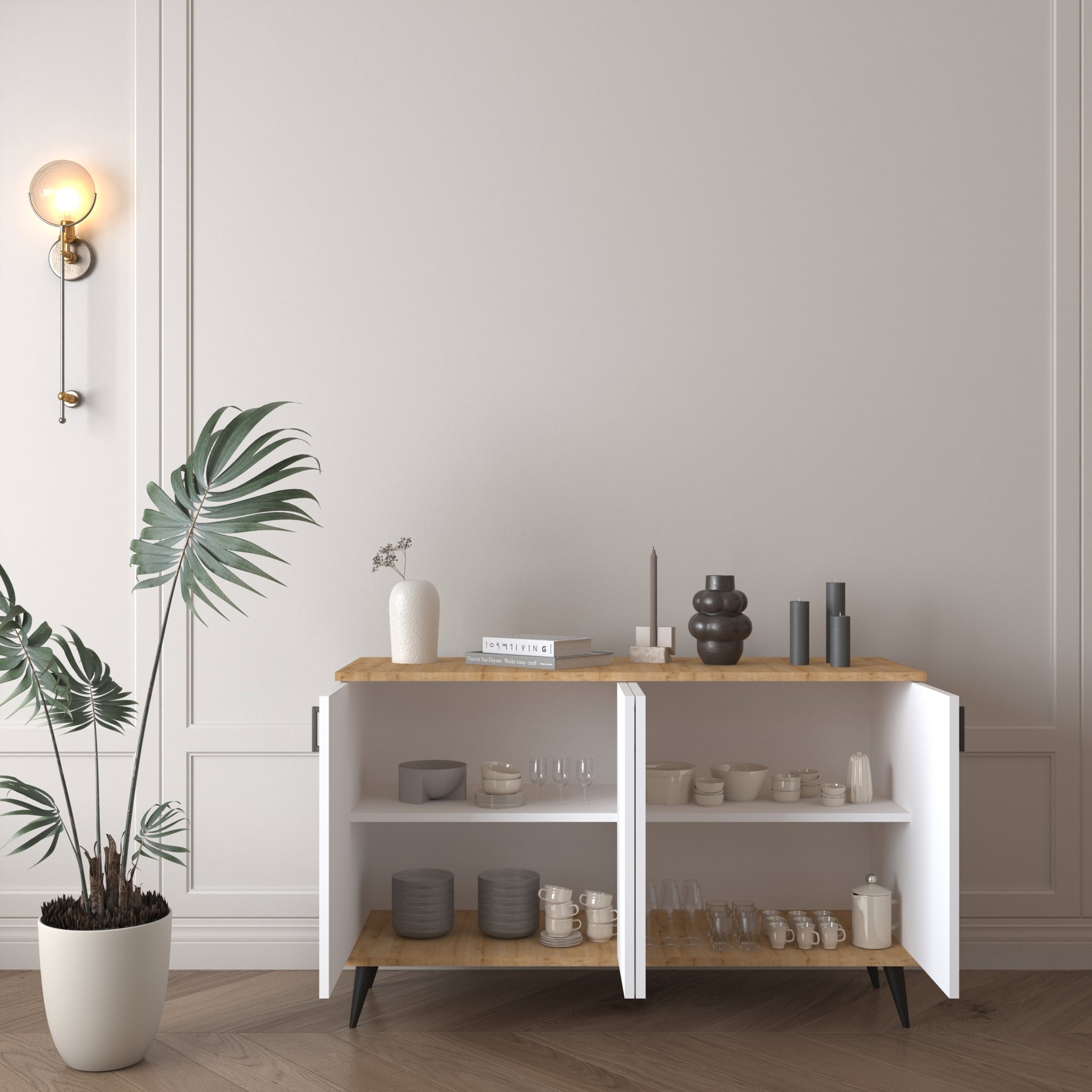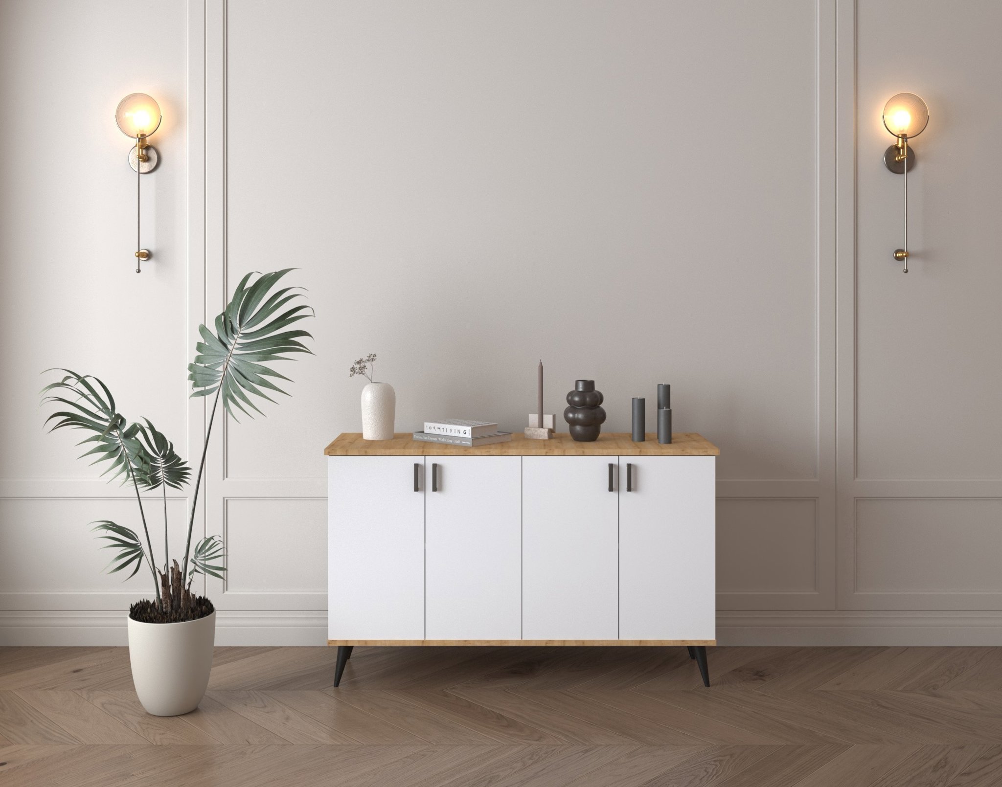 Şıklığı ve fonksiyonelliği bir arada sunan bu 4 kapaklı konsol, modern tasarımıyla her alanda kullanılabilir. Beyaz melamin kapaklar, sade bir görünüm sağlarken, safir meşe üst ve alt tablalar zarif bir dokunuş katar. Geniş depolama alanı ile oturma odası, salon veya giriş alanlarınızda eşyalarınızı düzenli bir şekilde saklamanızı sağlar.