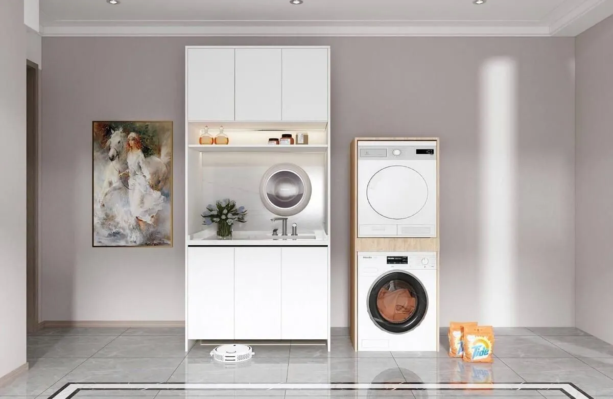 Çekmeceli Çamaşır ve Kurutma Makinesi Dolabı, beyaz renkli modern tasarımı ve geniş depolama alanıyla çamaşır odanıza şıklık ve düzen katıyor. Hem çamaşır hem de kurutma makinesi için ideal bir çözüm sunar.