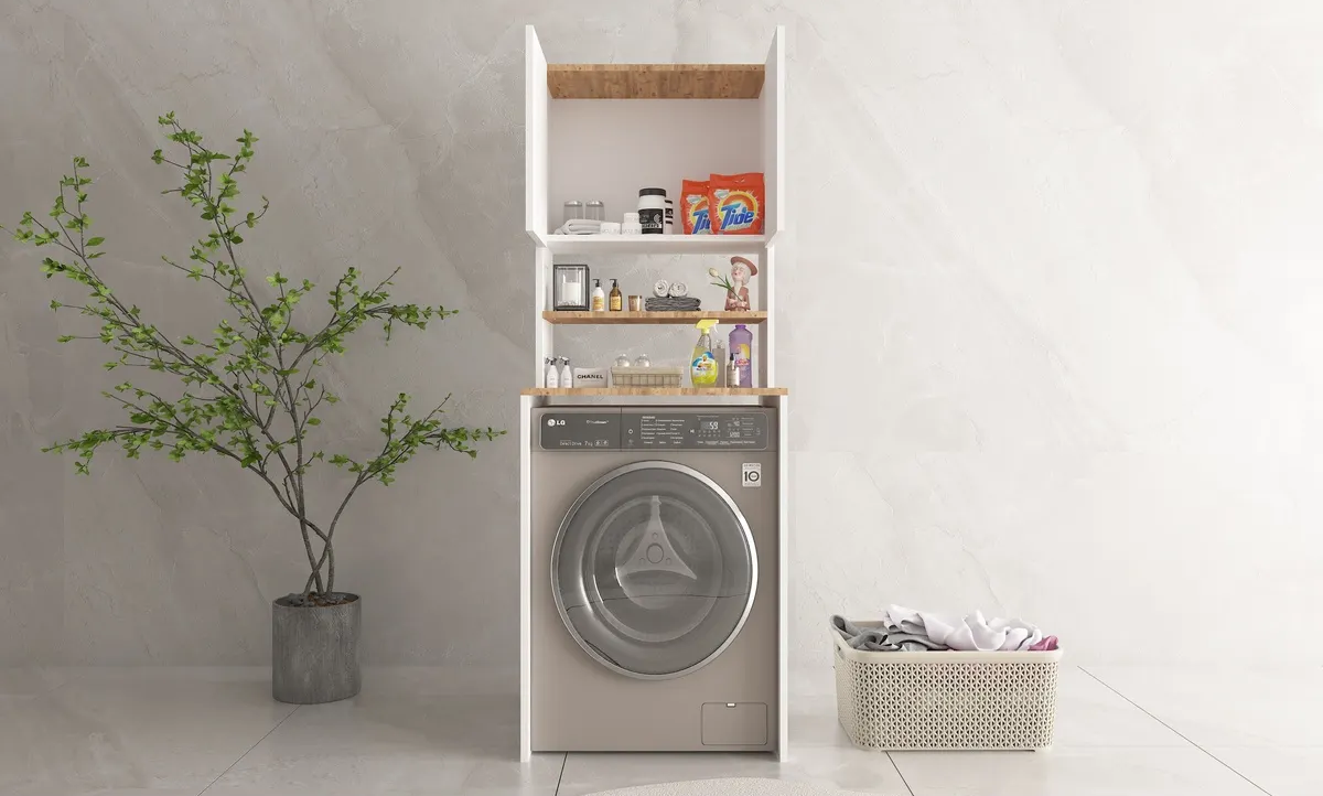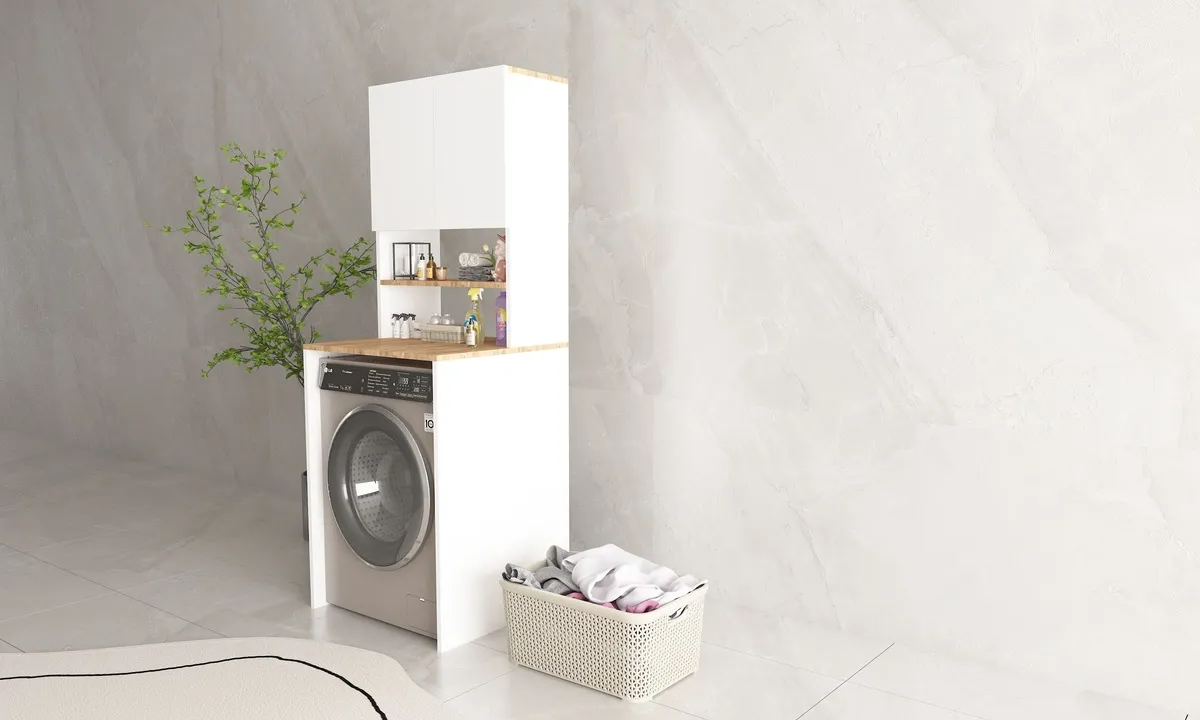 Bu çok amaçlı dolap, banyonuzda ya da çamaşır odasında hem işlevsel hem de estetik bir çözüm sunar. Çamaşır makinenizi düzenli ve şık bir şekilde yerleştirirken, diğer banyo malzemelerinizi de saklayabilirsiniz.