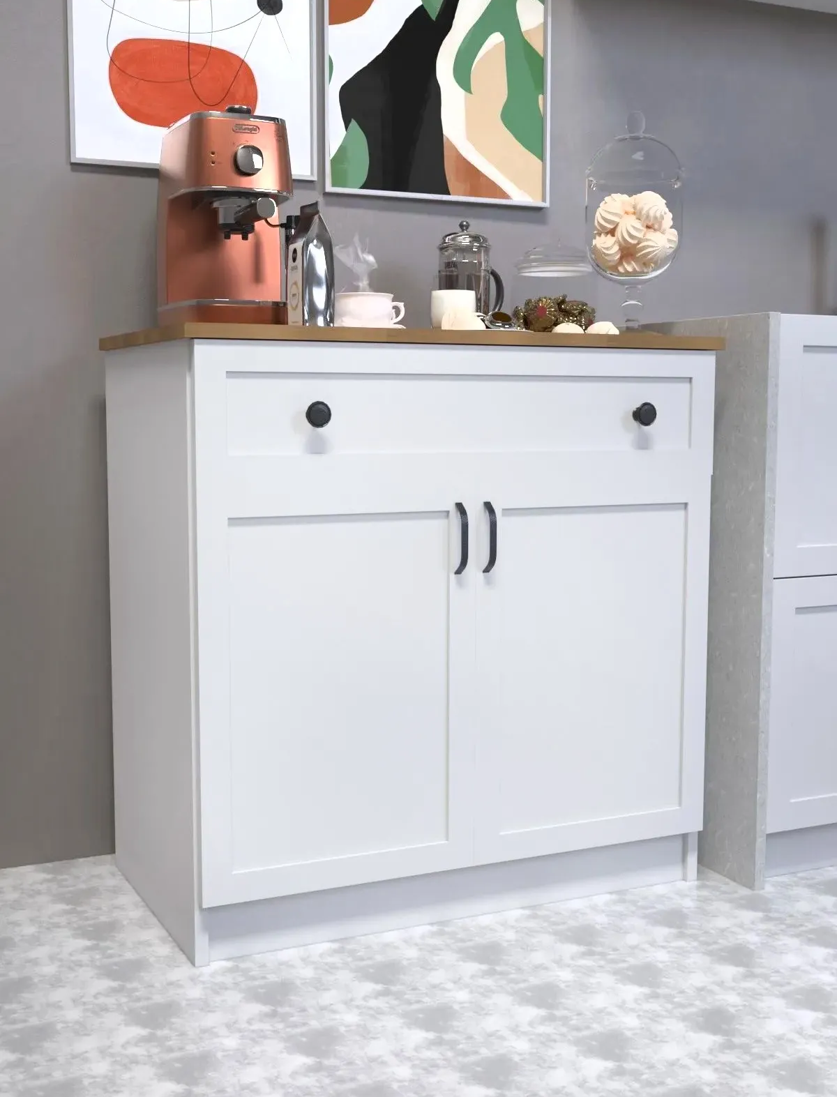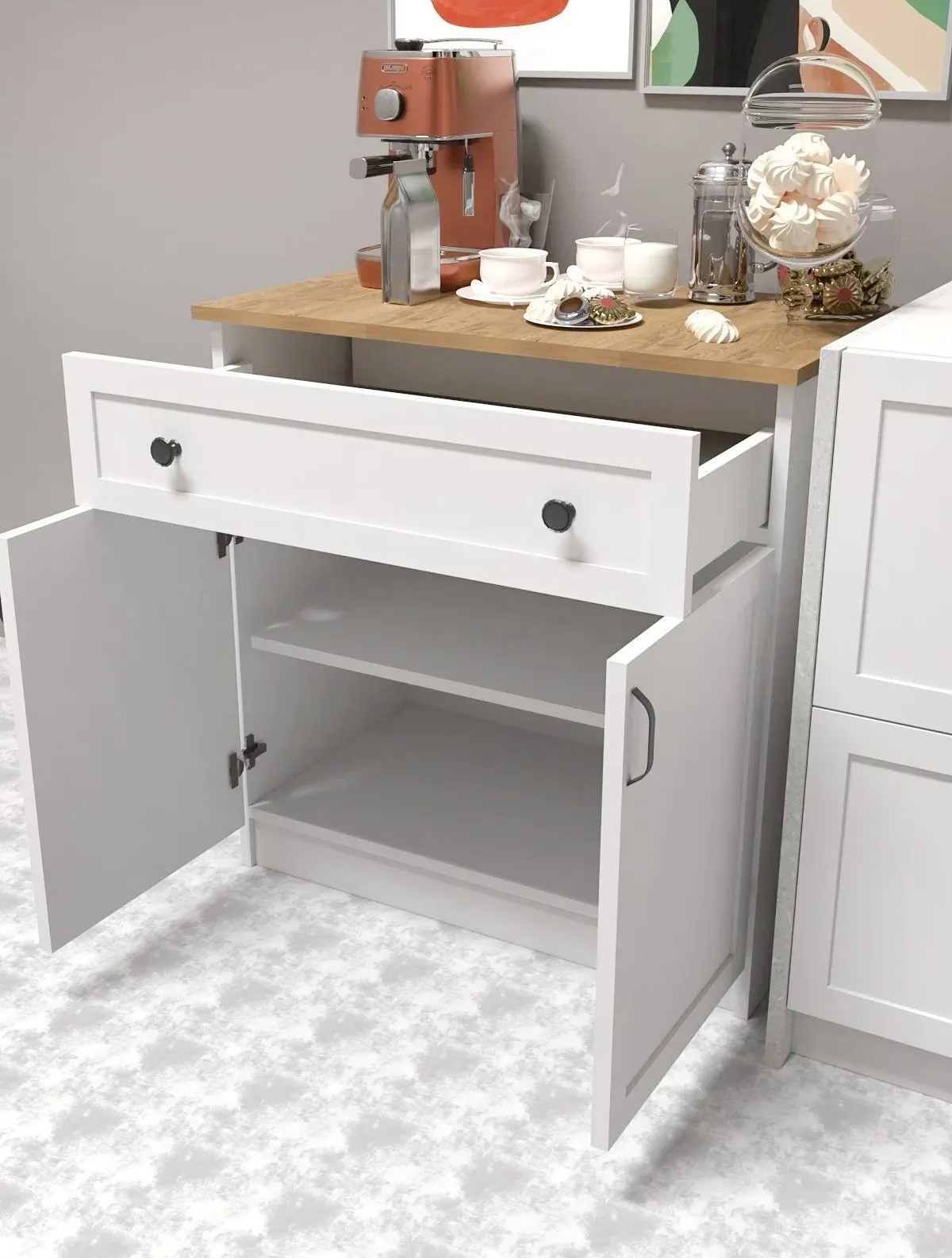 ✔ Estetik ve Kullanışlı: Kahve makinesi, fincanlar ve aksesuarlar için ideal saklama alanları sunar.