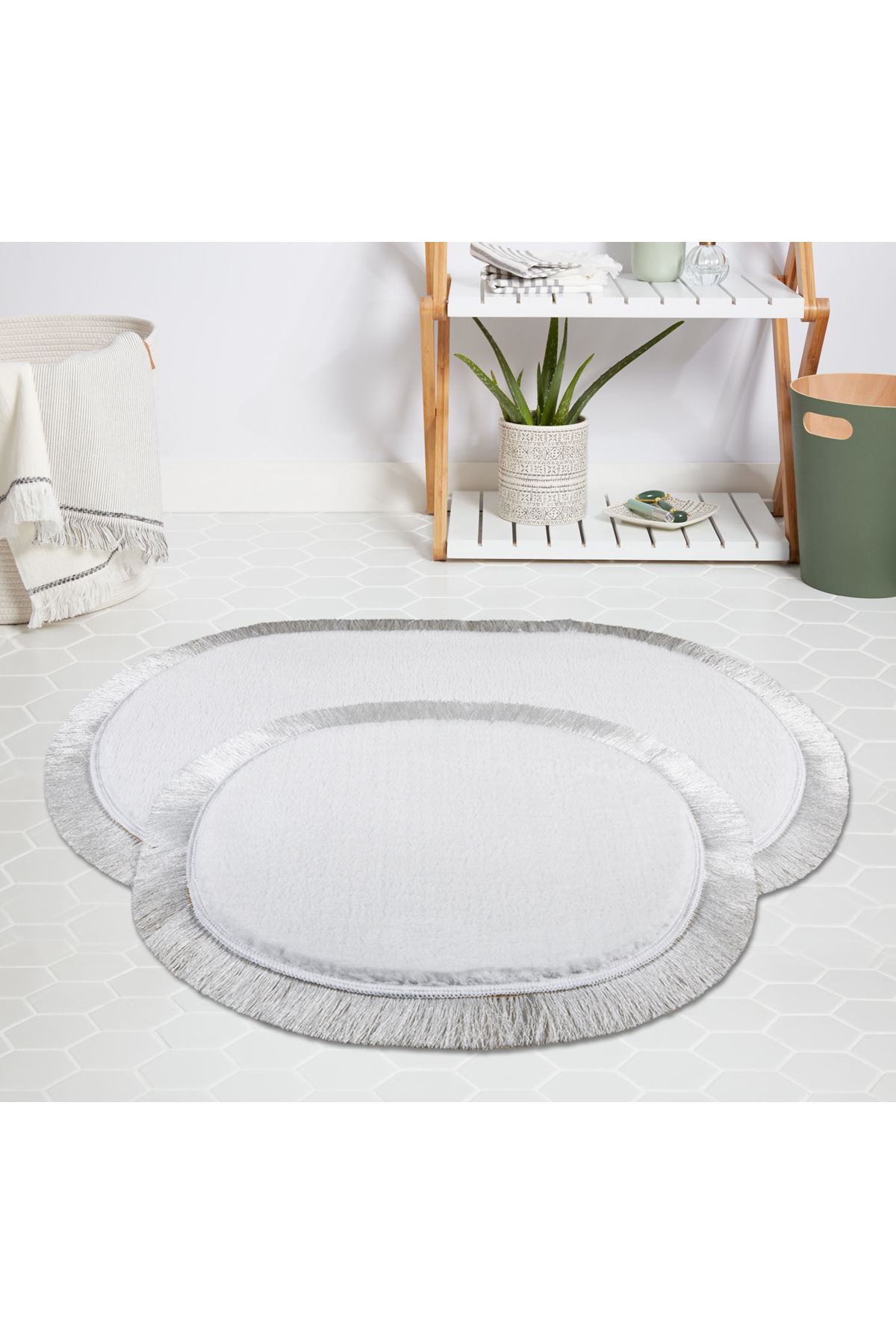 Saçaklı Peluş Post Beyaz 2 Parça Kaymaz Tabanlı Banyo Paspası