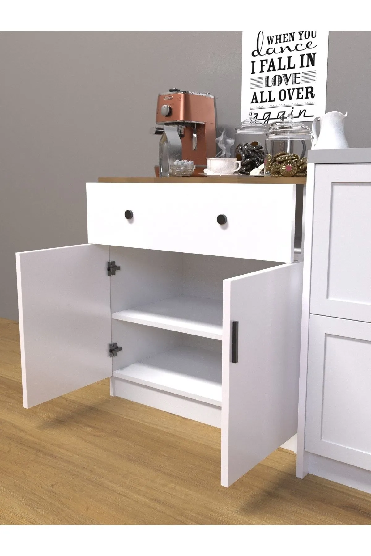 Fonksiyonel Depolama Alanı: Kahve köşesi, içecek hazırlama işlemini kolaylaştıran raflar, bölmeler ve çekmecelerle donatılmıştır. Kahve makineleri, su ısıtıcıları, kahve kupaları, kahve çekirdekleri ve şekerlemeler gibi tüm kahve hazırlama gereçlerinizi düzenli bir şekilde saklamanızı sağlar. Ayrıca, yer kaplamadan tüm eşyalarınızı yerleştirebileceğiniz pratik alanlar sunar.