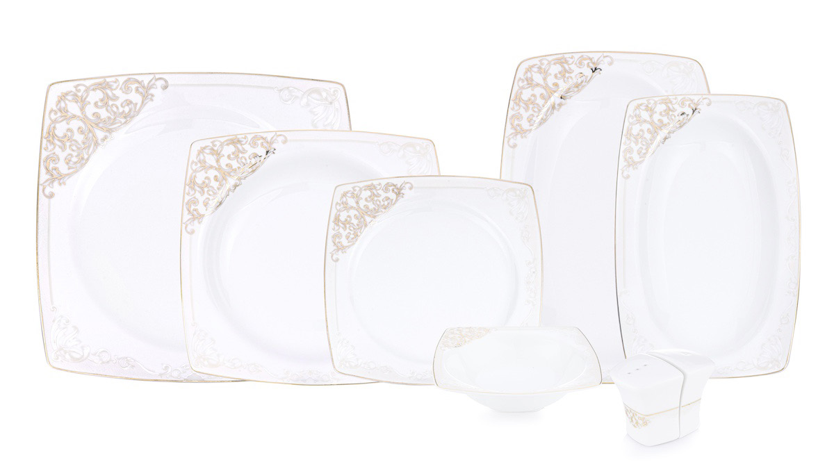 - Altın Detaylarla Lüks Tasarım: Bu zarif yemek takımı, altın renkli şeritlerle bezeli ve ince işçilikle tasarlanmış porselen parçalarla sofralarınıza asalet katar. Altın şeritler, takıma zarif bir ışıltı ve modern bir şıklık eklerken, her parça sofistike bir görünüm sunar. Özellikle özel davetlerde ve kutlamalarda göz alıcı bir atmosfer yaratır.