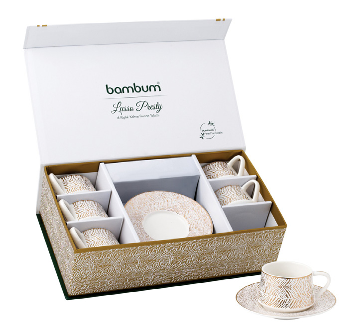 Lusso Prestij 6 Kişilik Kahve Fincan Takımı, zarif tasarımı ve kaliteli yapısıyla kahve keyfinizi prestijli bir hale getirir. Şıklığı, fonksiyonelliği ve lüksü bir arada sunan bu takım, her kahve anınızı özel kılacak!